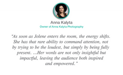 Little did I know that signing up for Jolene's lecture would be truly life-changing! She was an informative, engaging, and motivating speaker. I took away skills and knowledge that will be immediately useful in my personal and professional life. Thank you so much!